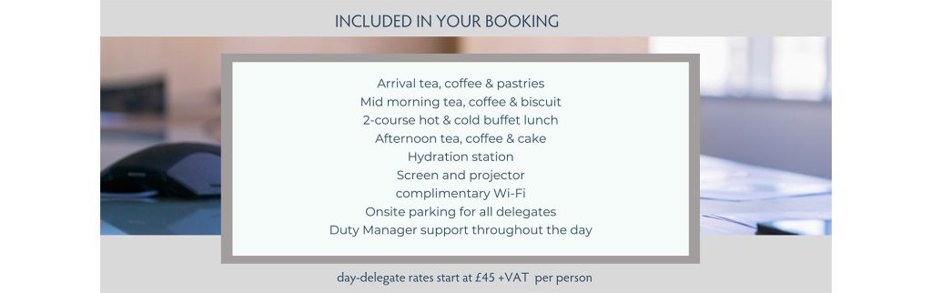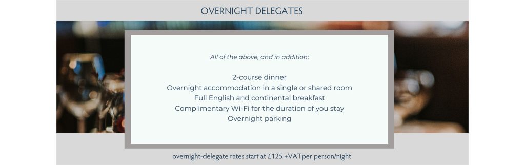 Delegate day rates start at £45 + VAT per person and overnight delegates stay for £125 + VAT per person per night. Please speak to the Event Team about the following optional extras that we can provide to enhance your delegate experience: