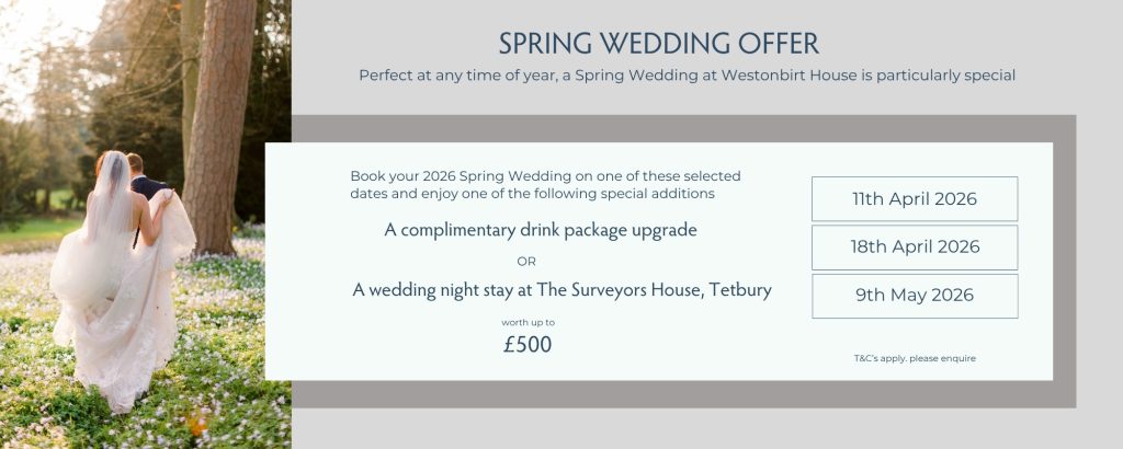 Book on selected Spring dates in 2026 and enjoy savings up to £500 and complimentary wedding night stay at the Surveyors House in nearby Tetbury. A beautiful home from home, for couples looking for a stylish start to life together.